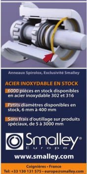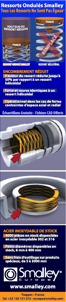 Smalley Europe est fabricant d'anneaux d'arrêt Spirolox et de ressorts ondulés à fil plat. 10000 pièces du catalogue; disponibles de 6 mm - 400 mm. Acier au carbone et Inox 302, 316, 17-7. Conceptions spéciales de 5 mm - 3000 mm.