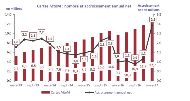 Le marché du MtoM connaît une expansion toujours plus forte chaque année. Une progression qui s’explique notamment par un nombre d’objets connectés qui ne cesse de s’accroître et qui atteindra selon l’Idate près de 80 milliards d’entités connectées en 2020. Le parc MtoM représente le nombre de cartes SIM utilisées pour la communication entre équipements distants (gestion à distance d'équipements, terminaux et serveurs, fixes ou mobiles). Ces cartes sont par exemple utilisées pour le traçage des objets et outils de travail (flottes de véhicules, machines...), à des fins d'actualisation de données (relevés à distance de compteurs, de capteurs...), d'identification et de surveillance de tous ordres (alarmes, interventions à distance... Les cartes sont comptabilisées que la communication se fasse uniquement en réception, uniquement en émission ou les deux. Ne sont pas comptabilisées dans cette rubrique les cartes utilisées pour les communications interpersonnelles et les cartes internet exclusives.
