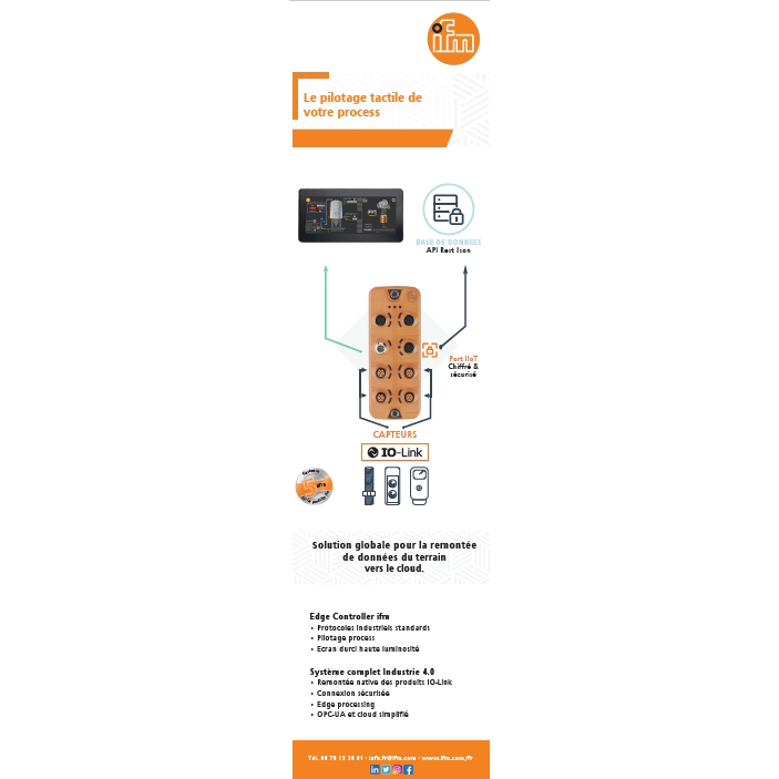 IFM propose une solution globale pour la remontée de données du terrain vers le cloud. Avec Edge Controller (protocoles industriels standards, pilotage process, écran durci haute luminosité). C'est un système complet Industrie 4.0 (remontée native des produits IO-Link, connexion sécurisée, edge processing, OPC-UA et cloud simplifié).