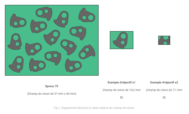 - Les appareils de mesure vidéo et les microscopes de mesure qui utilisent une image grossie et, tout comme un projecteur de profils, une platine de mesure est nécessaire pour déplacer et voir les différentes parties du composant. Les systèmes de mesure dans le champ de vision ne nécessitent pas de platine mobile, vu que l'intégralité de l'échantillon est visualisée dans un grand champ de vision (57 mm x 43 mm avec Xpress 70). Comparons cela à la taille d'un système de mesure optique traditionnel qui est généralement comprise entre 0,5 mm et 20 mm. (Fig 1)