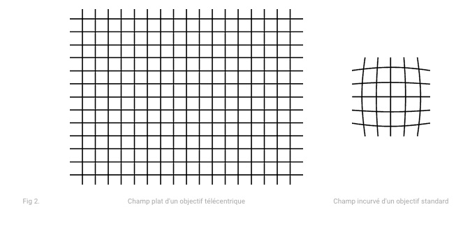 La mesure dans le champ de vision utilise une caméra vidéo haute résolution associée à un système d'objectif télécentrique à champ plat. L'objectif télécentrique fournit une image plate, dans l'ensemble du champ de vision, exempte de toute courbe ou distorsion, afin de pouvoir positionner et mesurer le composant n'importe où dans le champ de vision, sans incidence sur les mesures. (Fig 2)