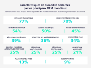 Une étude de Siemens Financial Services (SFS), intitulée « Les constructeurs de machines face aux enjeux de durabilité », évalue les caractéristiques favorisant la durabilité proposée par les 50 plus grands OEM au monde à leurs clients. Cette étude met également en évidence les priorités en matière de développement durable promues par les principaux constructeurs de machines. Plus de 75% de ces 50 plus grands constructeurs de machines promeuvent activement les moyens par lesquels leurs machines permettent une durabilité accrue pour les fabricants. L'efficacité énergétique (promue par 77% des principaux OEM) – un élément essentiel de la décarbonation et de l'efficacité des ressources – est l'avantage le plus largement cité en matière de développement durable. Près de la moitié des OEM consultés promeuvent aussi des caractéristiques de l'économie circulaire, sous la forme de retrofit/rénovations (54%) et de pièces reconditionnées (45%). Reconnaître la nécessité d'investir dans des machines de fabrication plus durables est une chose. Trouver les capitaux en est une autre – qu'il s'agisse d'un équipement entièrement neuf ou d'une modernisation par retrofit, souligne l’étude. Des solutions de financement spécialisées aident les fournisseurs de machines et d'équipements technologiques à vendre leur offre plus durable en permettant au fabricant d'investir facilement via des paiements mensuels, sans avoir besoin de trouver (et d'immobiliser) des sommes importantes d'un capital limité.